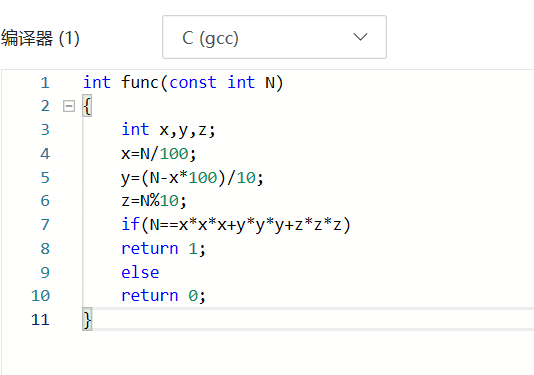 其中N是用户传入的参数。N的值不超过int类型的范围。如果参数N是水仙花数,则返回1,否则返回0。