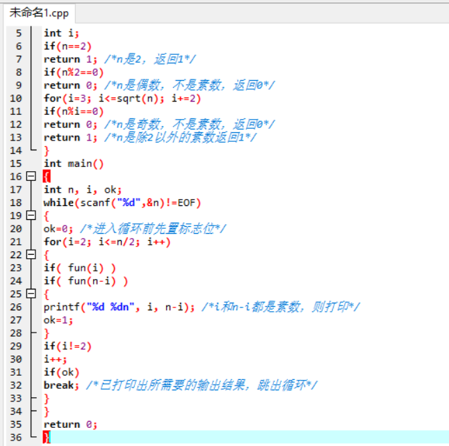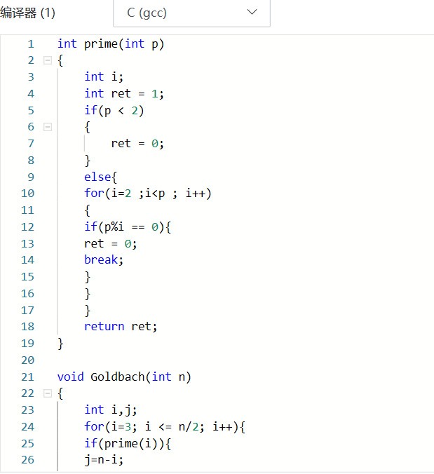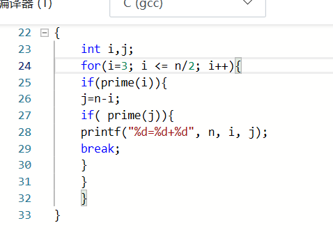 其中函数prime当用户传入参数p为素数时返回1,否则返回0;函数Goldbach按照格式“n=p+q”输出n的素数分解,其中p≤q均为素数。又因为这样的分解不唯一(例如24可以分解为5+19,还可以分解为7+17),要求必须输出所有解中p最小的解。