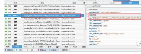 等跳转成功后,你就可以看到好多日志记录了,点击图中的那一行 login.taobo.com,然后查看参数,你就会发现表单数据了,其中就包括 ua 还有下面的 password2,把这俩复制下来,我们之后要用到的。这就是我们需要的 ua 还有 aes 加密后的密码。