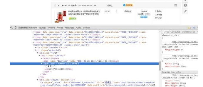 这是我的已买到的宝贝界面,审查元素可以看到,每一个宝贝都是tbody标签包围着。