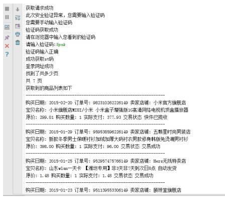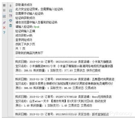 #u'\u8ba2\u5355\u53f7'是订单号的编码 pattern = re.compile(u'dealtime.*?>(.*?)</span>.*?\u8ba2\u5355\u53f7.*?<em>(.*?)</em>.*?shopname.*?title="(.*?)".*?baobei-name">.*?<a.*?>(.*?)</a>.*?' u'price.*?title="(.*?)".*?quantity.*?title="(.*?)".*?amount.*?em.*?>(.*?)</em>.*?trade-status.*?<a.*?>(.*?)</a>',re.S) result = re.findall(pattern,page) for item in result: print '------------------------------------------------------------' print "购买日期:",item[0].strip(), '订单号:',item[1].strip(),'卖家店铺:',item[2].strip() print '宝贝名称:',item[3].strip() print '原价:',item[4].strip(),'购买数量:',item[5].strip(),'实际支付:',item[6].strip(),'交易状态',item[7].strip()