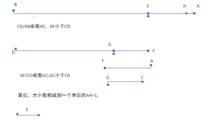 5)因为CD大于FA,不断重复这一过程,最后可得余数HA=1,