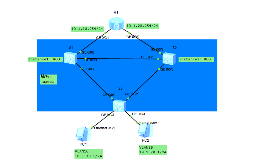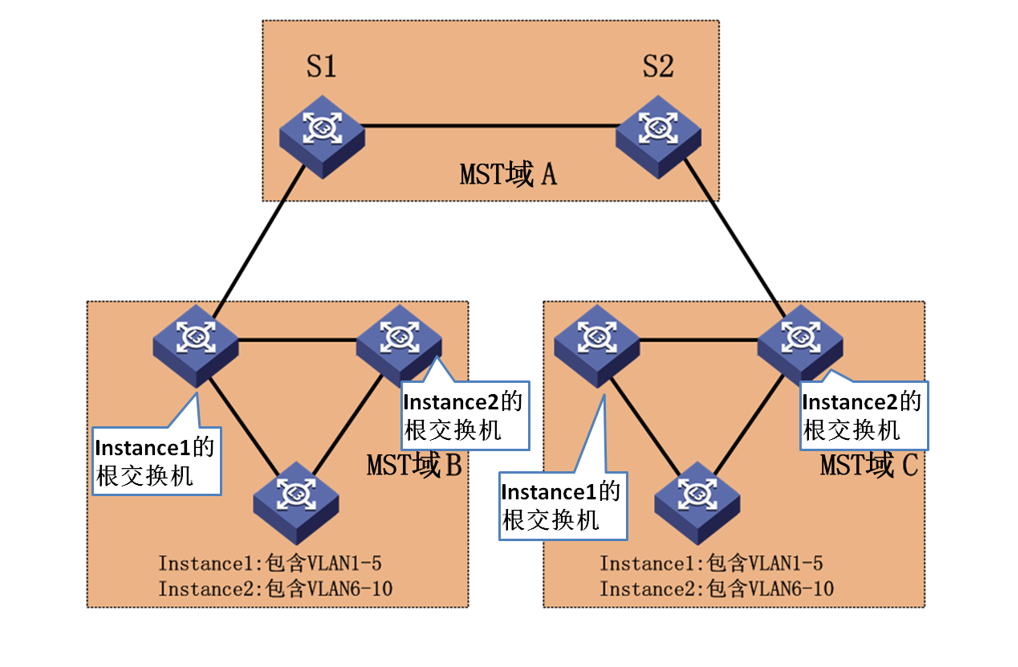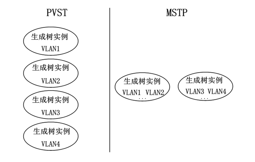 MSTP把一个交换网络划分成多个域,每个域内形成多棵生成树,生成树之间彼此独立。每棵生成树成为一个多生成树实例(MSTI),每个域称为一个MST域。