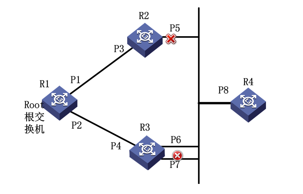 **指定端口:**该交换机向下游交换机发送BPDU或者数据流量的端口;图中的P1、P2、P6(R3优先级高于R2)端口为指定端口。