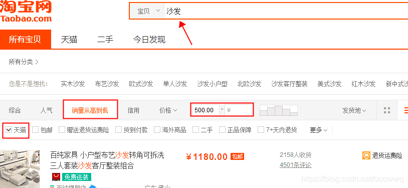 筛选条件:天猫、销量从高到低、价格 500 元以上。