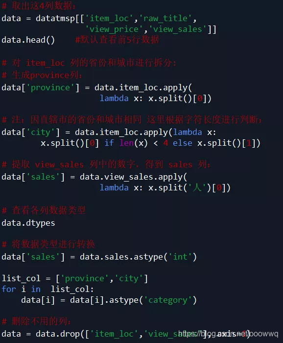 说明:根据需求,本案例中只取了 item_loc,raw_title,view_price,view_sales 这 4 列数据,主要对区域、标题、价格、销量进行分析。