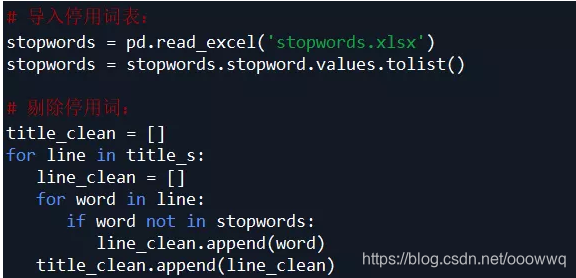对 title_s(list of list 格式)中的每个 list 的元素(str)进行过滤,剔除不需要的词语,即把停用词表 stopwords 中有的词语都剔除掉: