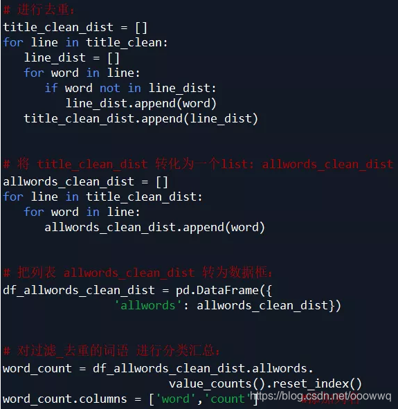 因为下面要统计每个词语的个数,所以为了准确性,这里对过滤后的数据 title_clean 中的每个 list 的元素进行去重,即每个标题被分割后的词语唯一。