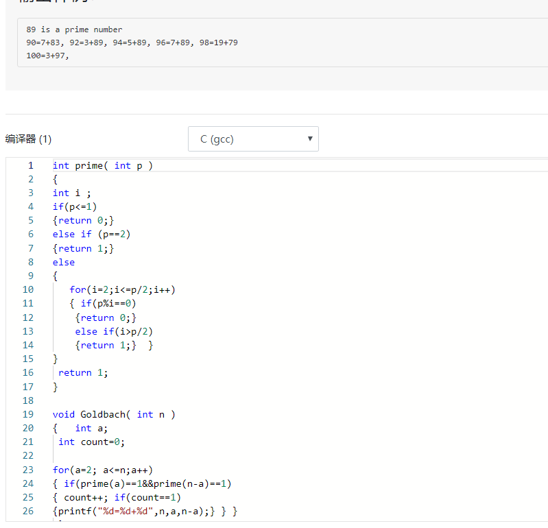 | 89 100 | 89 is a prime number 90=7+83, 92=3+89, 94=5+89, 96=7+89, 98=19+79 100=3+97 | 输入大于6的数 |