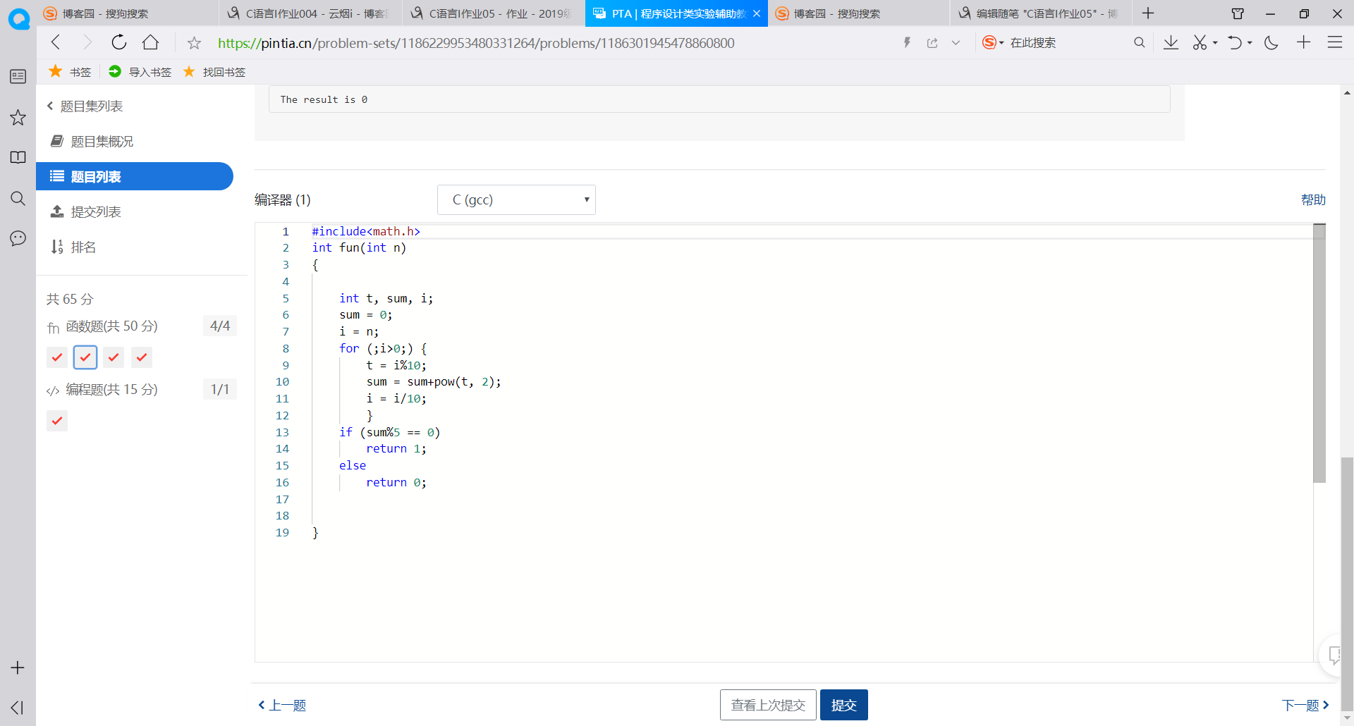 提交列表说明:编程作业都是在VS上先做好,然后直接粘贴到PTA上去,while语句的意义了解不透彻,容易跟for语句弄混,在编程中用for语句总是达不到目的,后来经过同学提醒,学会用wihile语句。