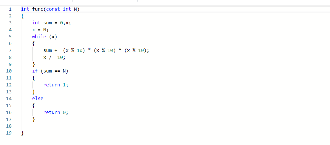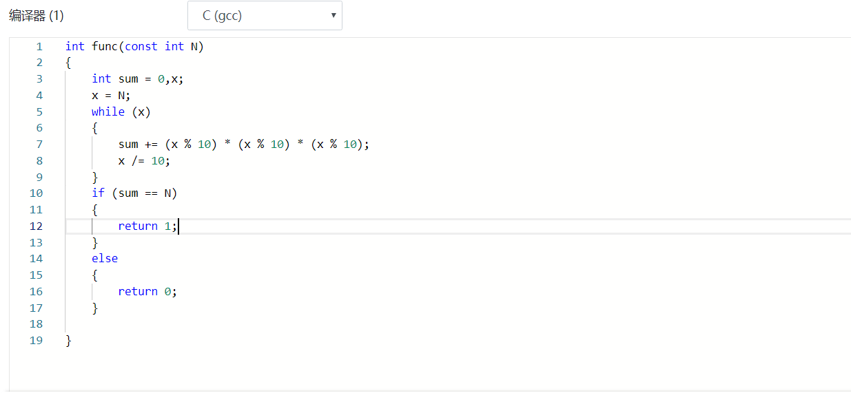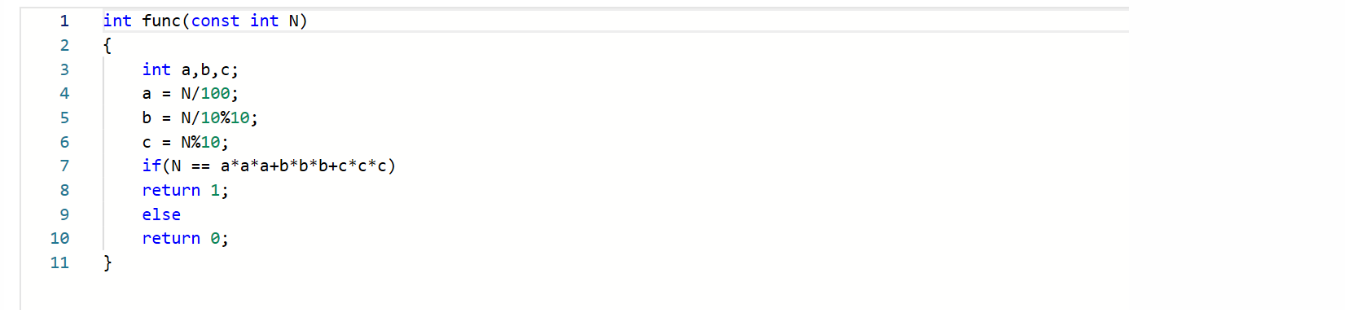 题目内容描述:本题要求实现一个函数,判断任一整数是否为水仙花数(必须是三位数,且数的每一位上数字的立方和与数本身相等)。例如153=1^3+5^3+3^3=1+125+27=153,而1或155则不是水仙花数。如果是水仙花数,则函数返回1,否则返回0.