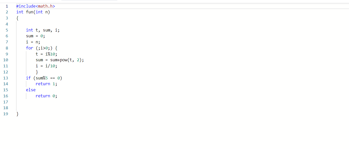 题目内容描述:编写函数fun,其功能是:判断一个整数的各位数字平方之和能否被5整除,可以被5整除则返回1,否则返回0。