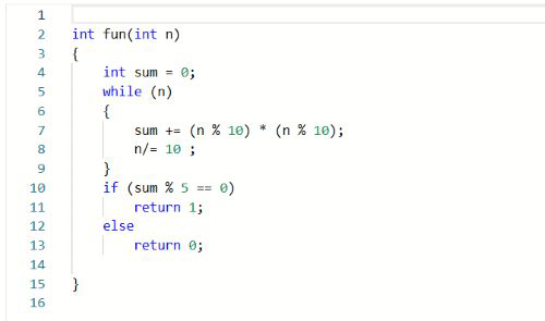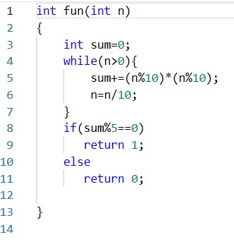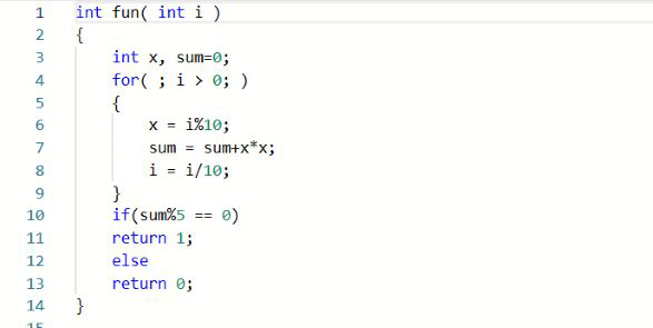 1.1.1 题目内容:编写函数fun,其功能是:判断一个整数的各位数字平方之和能否被5整除,可以被5整除则返回1,否则返回0.