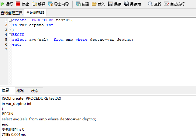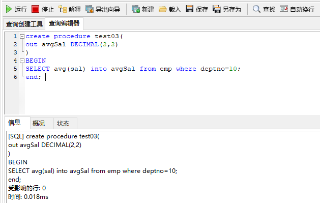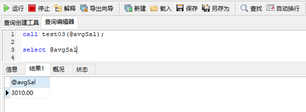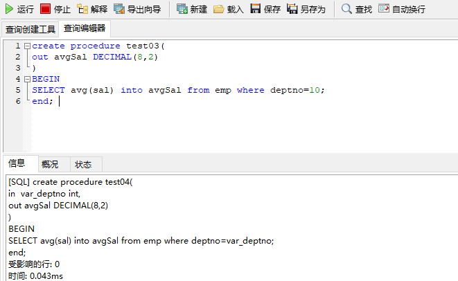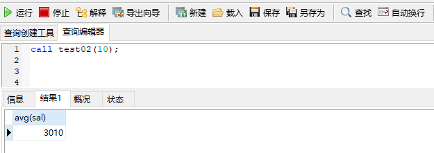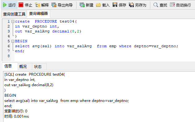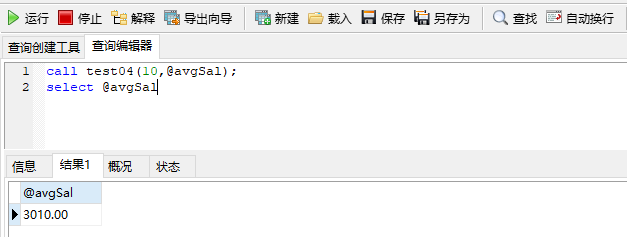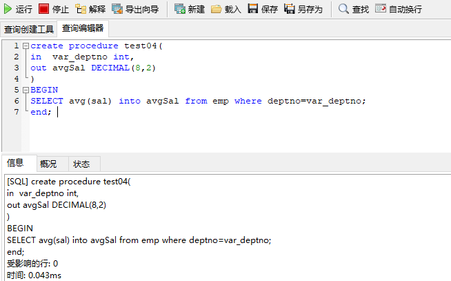 1.创建一个无参存储函数 功能:查询10部门的平均工资 调用结果: 2.创建一个带输入参数的存储函数 运行结果: 3.创建一个带输出参数的存储函数 运行结果: 4.创建一个带输入参数,输出参数的存储函数 运行结果: 注意事项: 1.存储函数的调用用 call 存储函数名(@变量名) 来源:https://blog.csdn.net/qq_38423256/article/details/102759691 标签 mysql函数