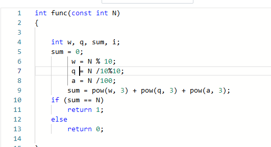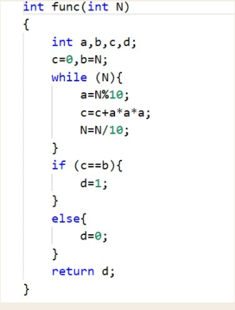 题目要求:本题要求实现一个函数,判断任一整数是否为水仙花数(必须是三位数,且数的每一位上数字的立方和与数本身相等)。例如153=1^3+5^3+3^3=1+125+27=153,而1或155则不是水仙花数。如果是水仙花数,则函数返回1,否则返回0.