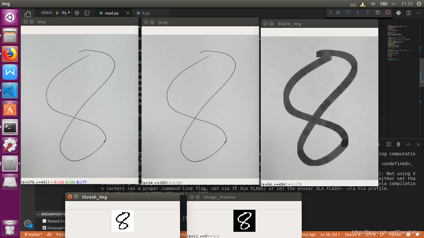 二值化后取反,二值化是为了等下取反,二值化是将图片完全转换成为黑白图片,亮的部分为白色。但是输入的样本数字应该是黑底白字的,你不可能用白色的笔在黑色纸上写字把(一般是白底黑字),所以对二值化后的图像取反即可得到想要的黑底白字的图像效果。