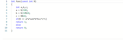 判断任一整数是否为水仙花数(必须是三位数,且数的每一位上数字的立方和与数本身相等)。例如153=1^3+5^3+3^3=1+125+27=153,而1或155则不是水仙花数。如果是水仙花数,则函数返回1,否则返回0.