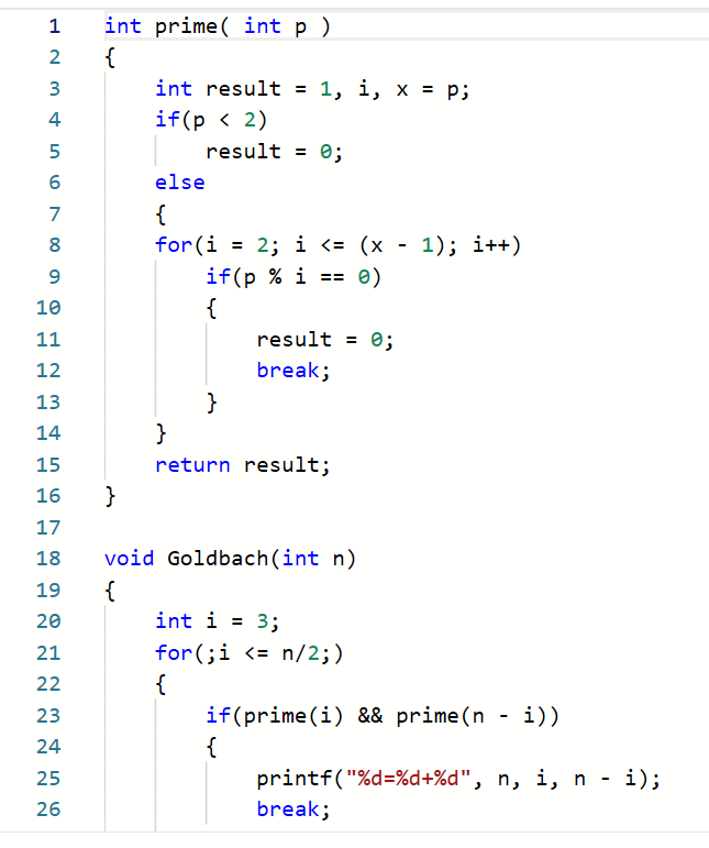 函数参数:主调函数:int main();被调函数:int prime( int p ),void Goldbach(int n);
