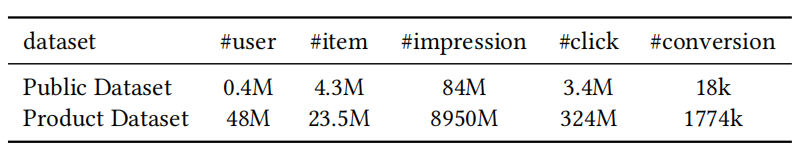 数据集 目前还没用同时包含点击、转化信息的公开数据集,作者从淘宝日志中抽取整理了一个数据集Product,并开源了从Product中随机抽样1%构造的数据集Public(约38G)。