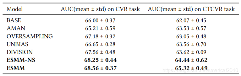 衡量指标 在点击样本上,计算CVR任务的AUC;同时,单独训练一个和BASE一样结构的CTR模型,除了ESMM类模型,其他对比方法均以pCTR*pCVR计算pCTCVR,在全部样本上计算CTCVR任务的AUC。