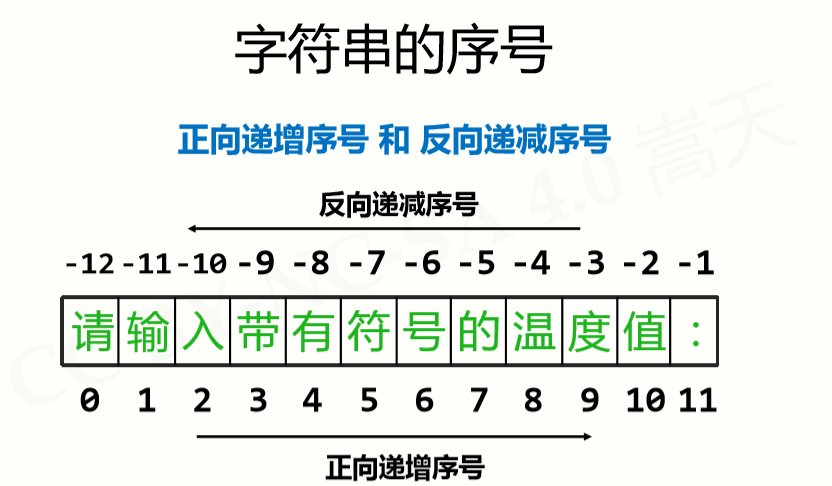 字符串是字符的有序序列,可以对其中的字符进行索引 "请" 是 "请输入带有符号的温度值: " 的第0个字符