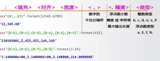 format()方法的使用:<模板字符串>.format(<逗号分隔的参数>)