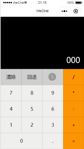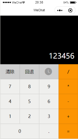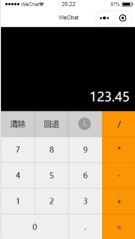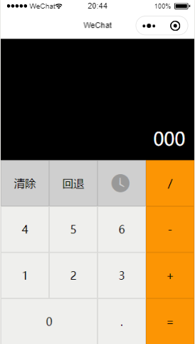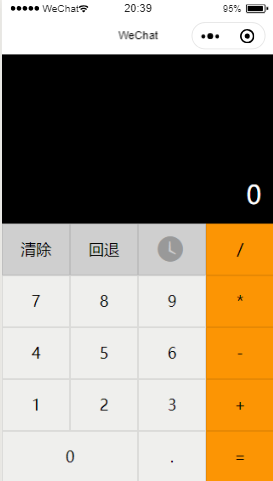 - 第九步:既然是计算器,那么我们应该有显示界面,so我们在a2.wxss中添加如下代码块,还有就是为了整个界面的美观性我们的键盘应该有不同的颜色,所以,我们对不同的按钮添加不同的class=“white/orange/gry”,在a2.wxss中添加对应的.white{白色},.orange{橙色},.gry{灰色}