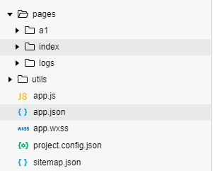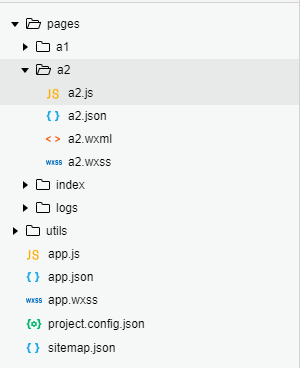 更改后:界面结构中多出来了一个a2目录,并且该目录下也同时创建了相应的a2.js、a2.json、a2.wxml、a2.wxss.