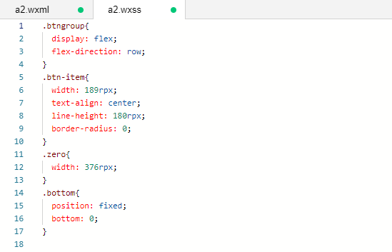 - 第八步:计算器的键盘应该是放置于最底部的,因此,我们添加如下代码块将键盘放置在最底部,首先我们将显示四行按钮的代码放入一个新的view中做为子view,添加一个class=“bottom”,同时我们在a2.wxss中添加bottom的样式距离底部距离为0