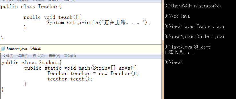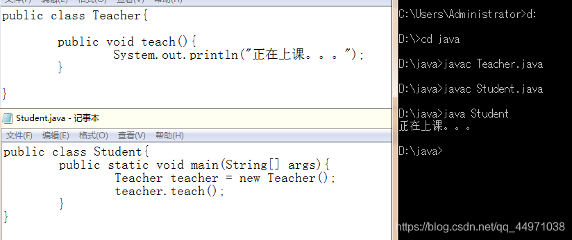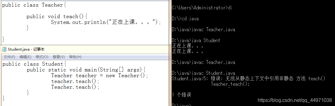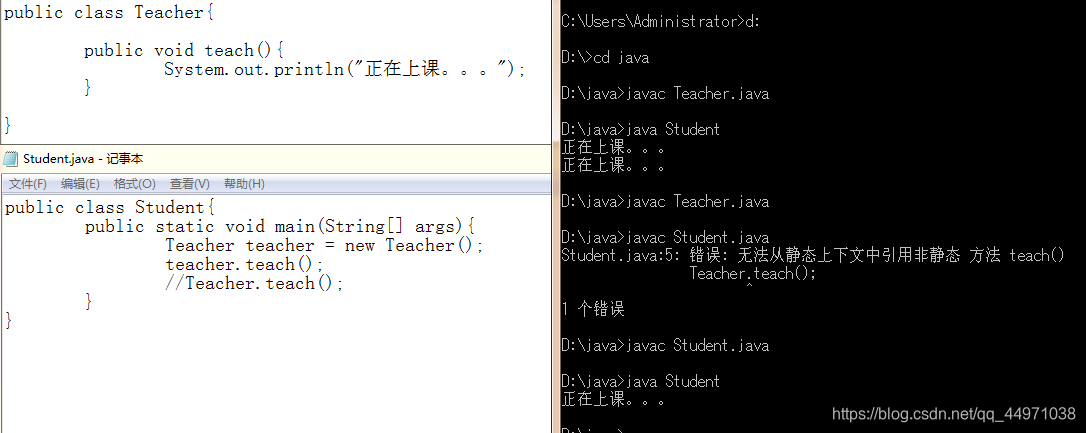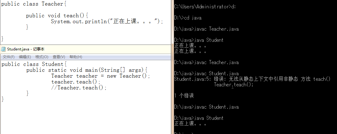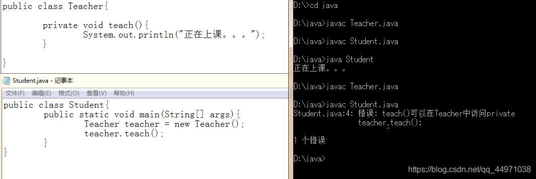 我们先创建一个 Teacher类,定义一个方法 teach();用 public 修饰此方法,然后定义另一个类,定义 main();创建Teacher类的一个对象teacher(注意大小写,前面的Teacher是类,后面的teacher是具体的对象);调用 teach() 方法,则会显示我们定义的 teach() 方法的内容。如果将 Teacher类 中的 teach() 方法用 private 修饰,则会报错,因为 private 修饰的方法和属性只能在同一个类中调用。