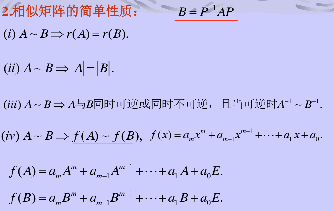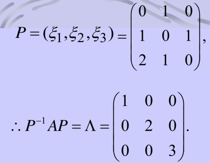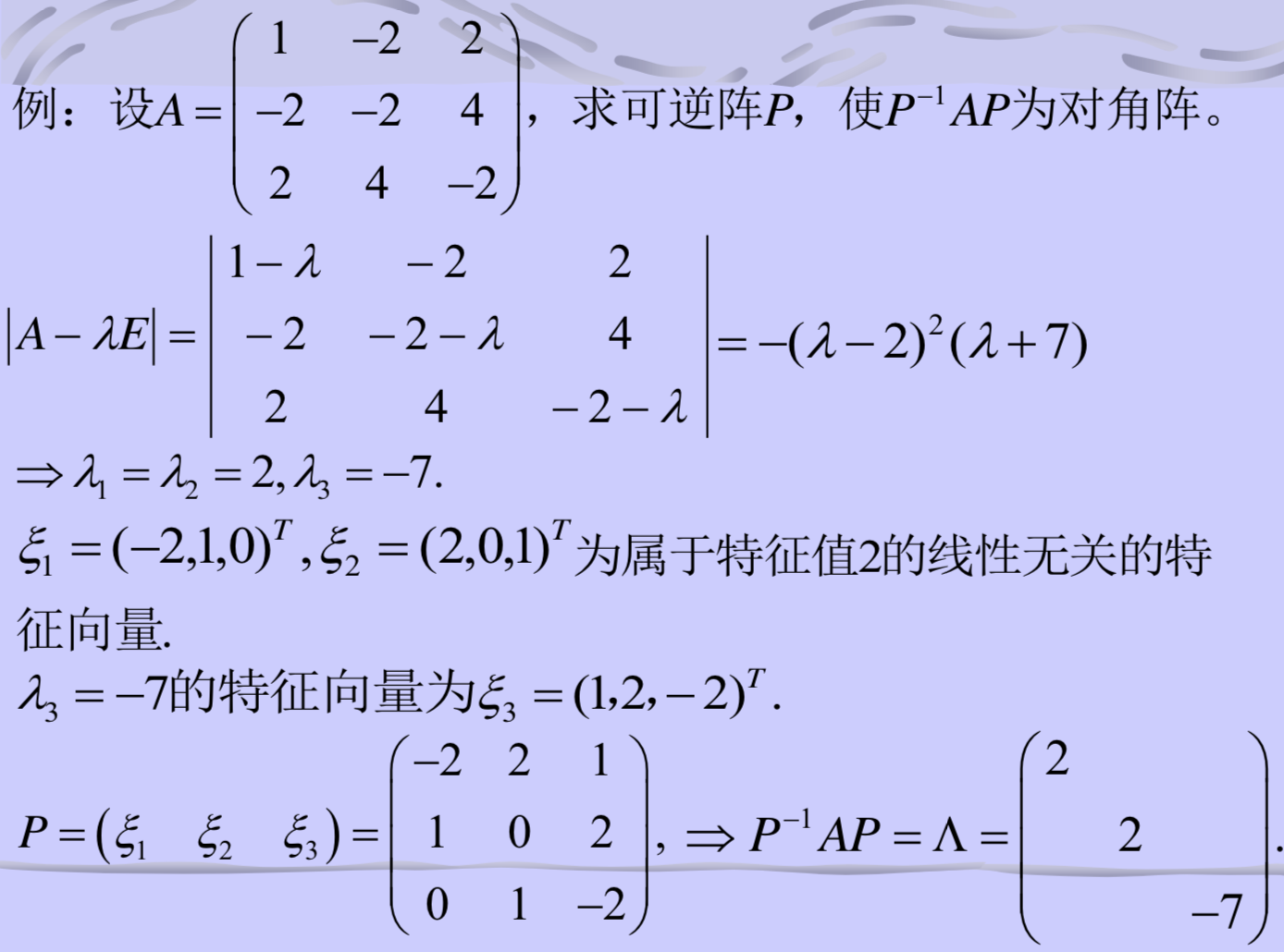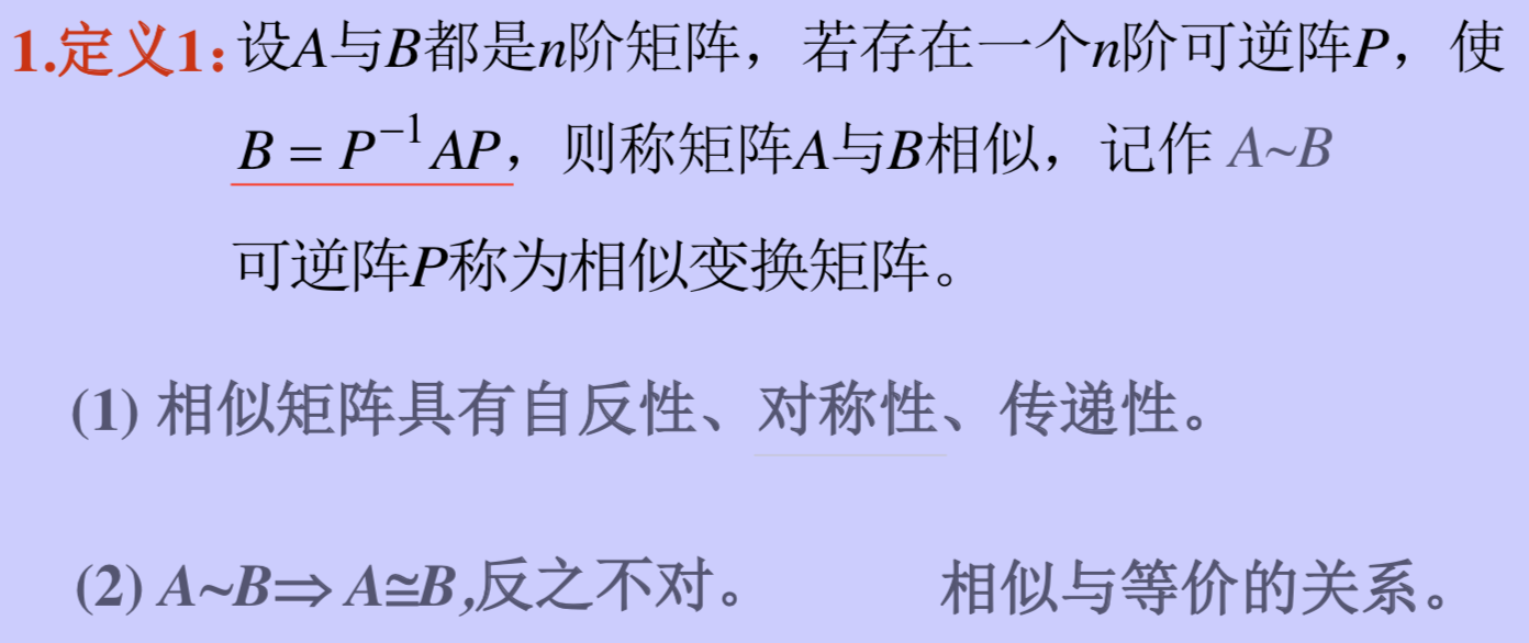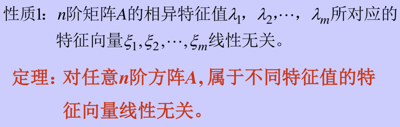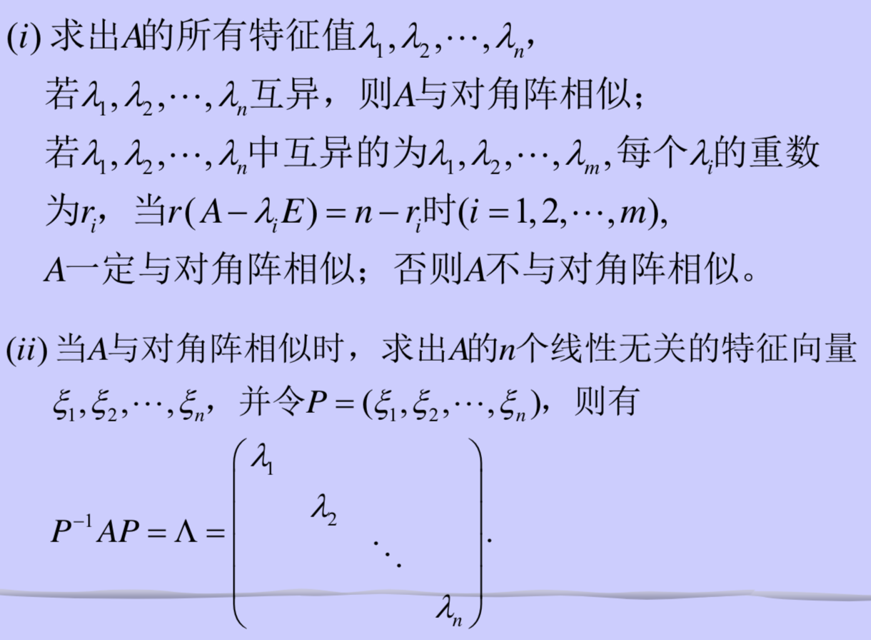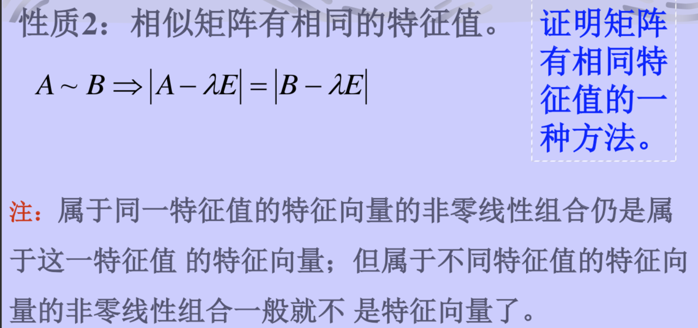 推论:若n阶矩阵A有n个互异的特征值,则A与对角阵相似,反之不对。