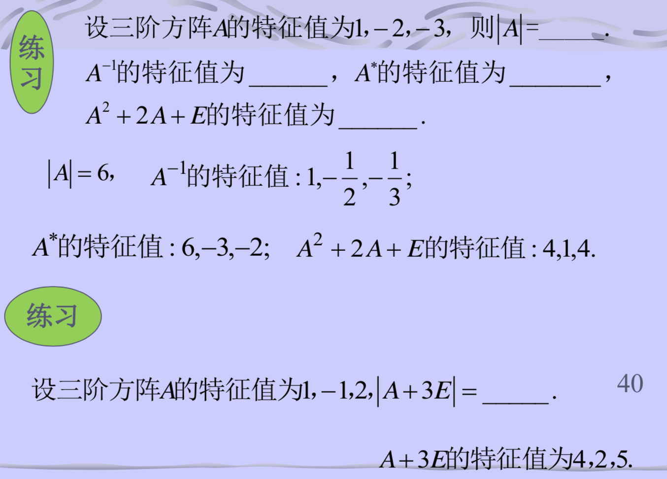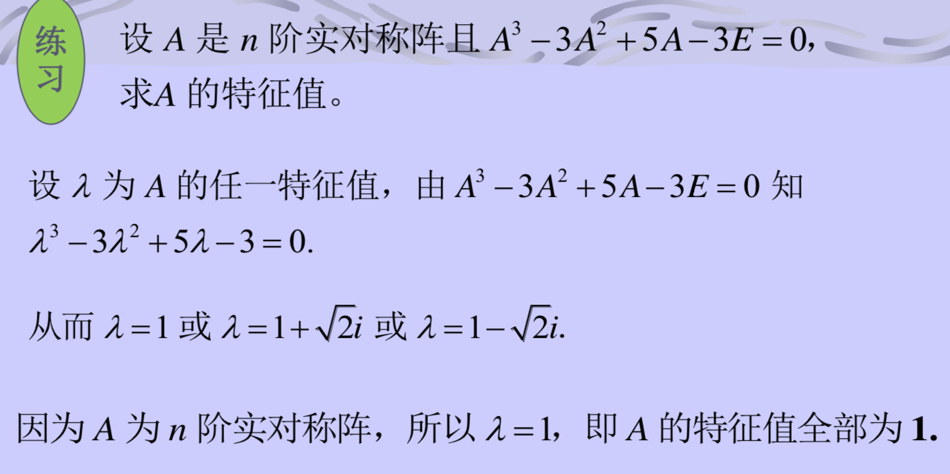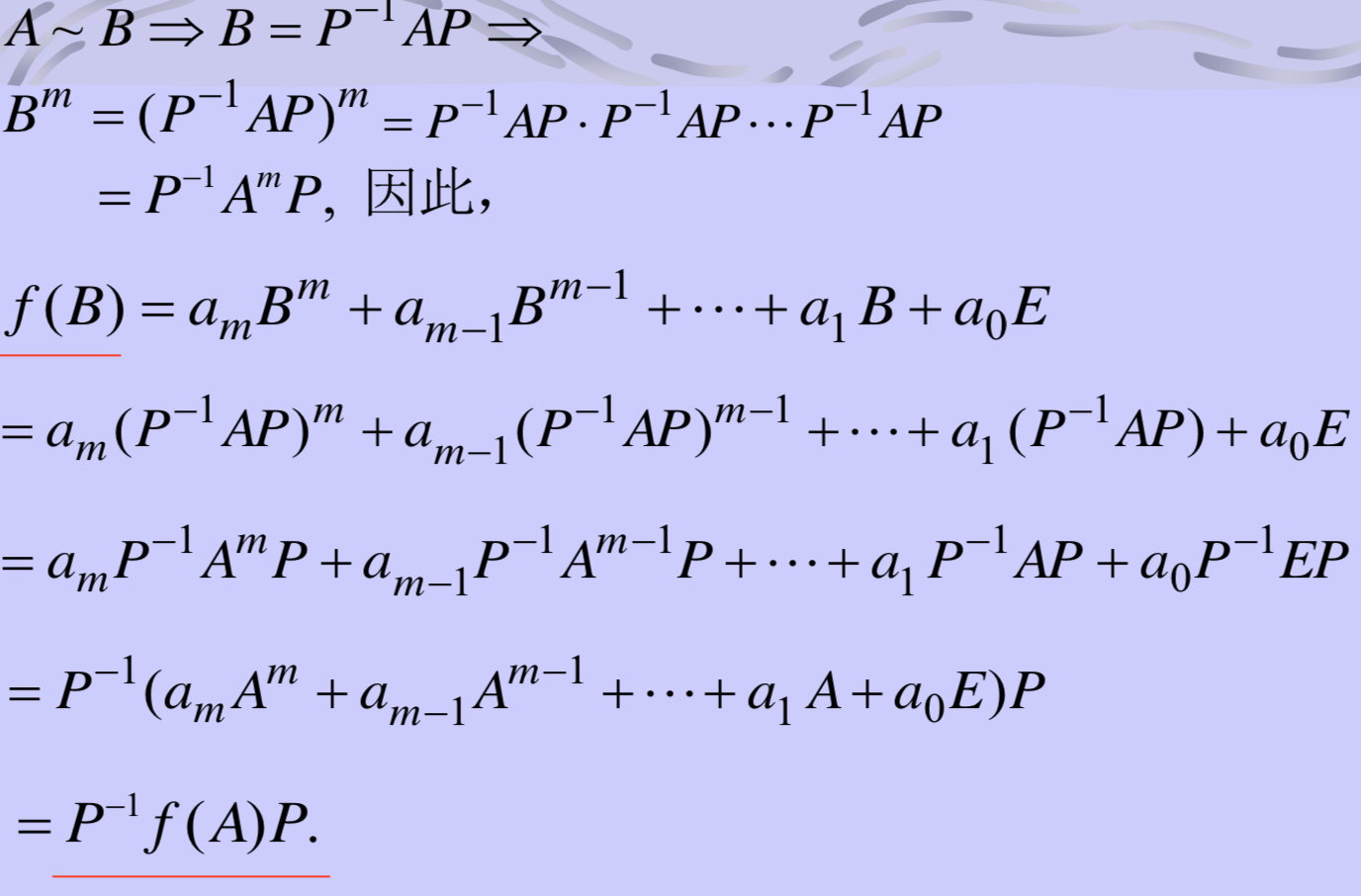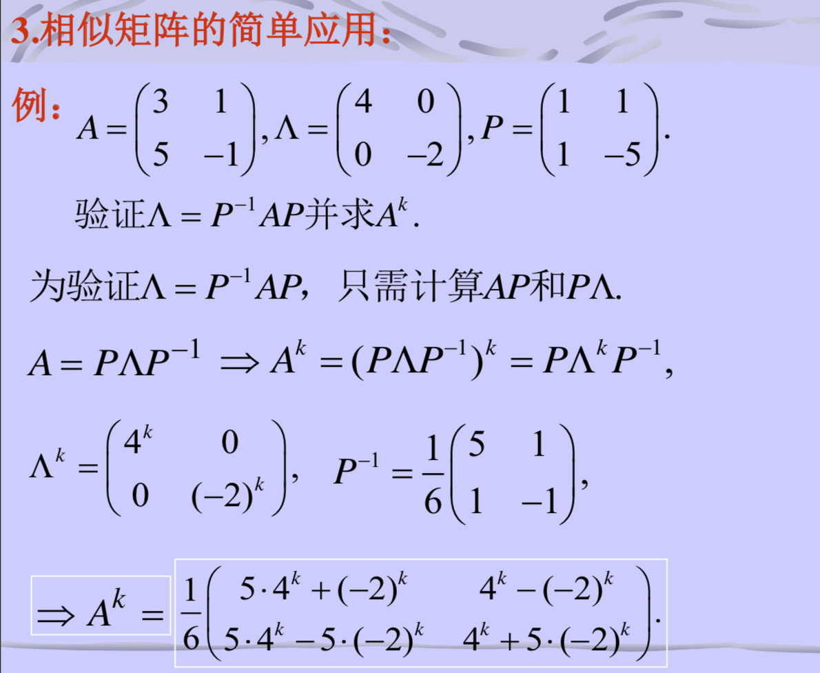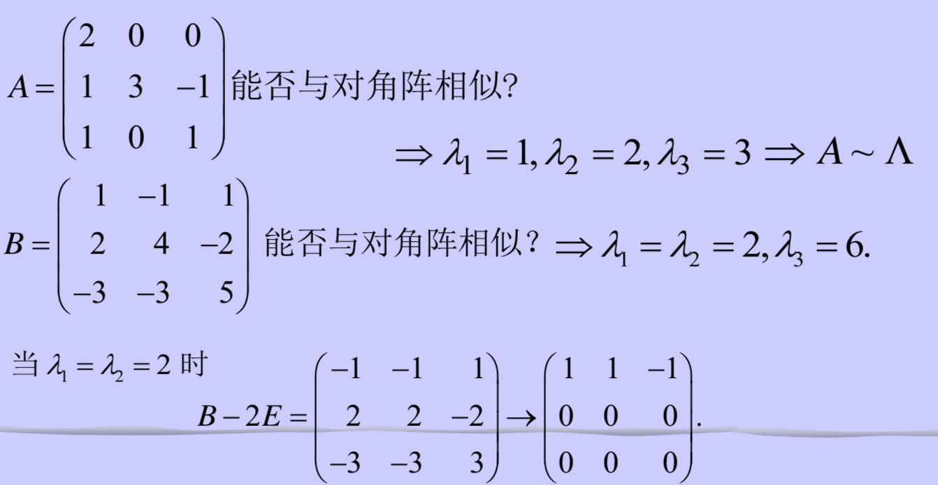 推论:若n阶矩阵A有n个互异的特征值,则A与对角阵相似,反之不对。