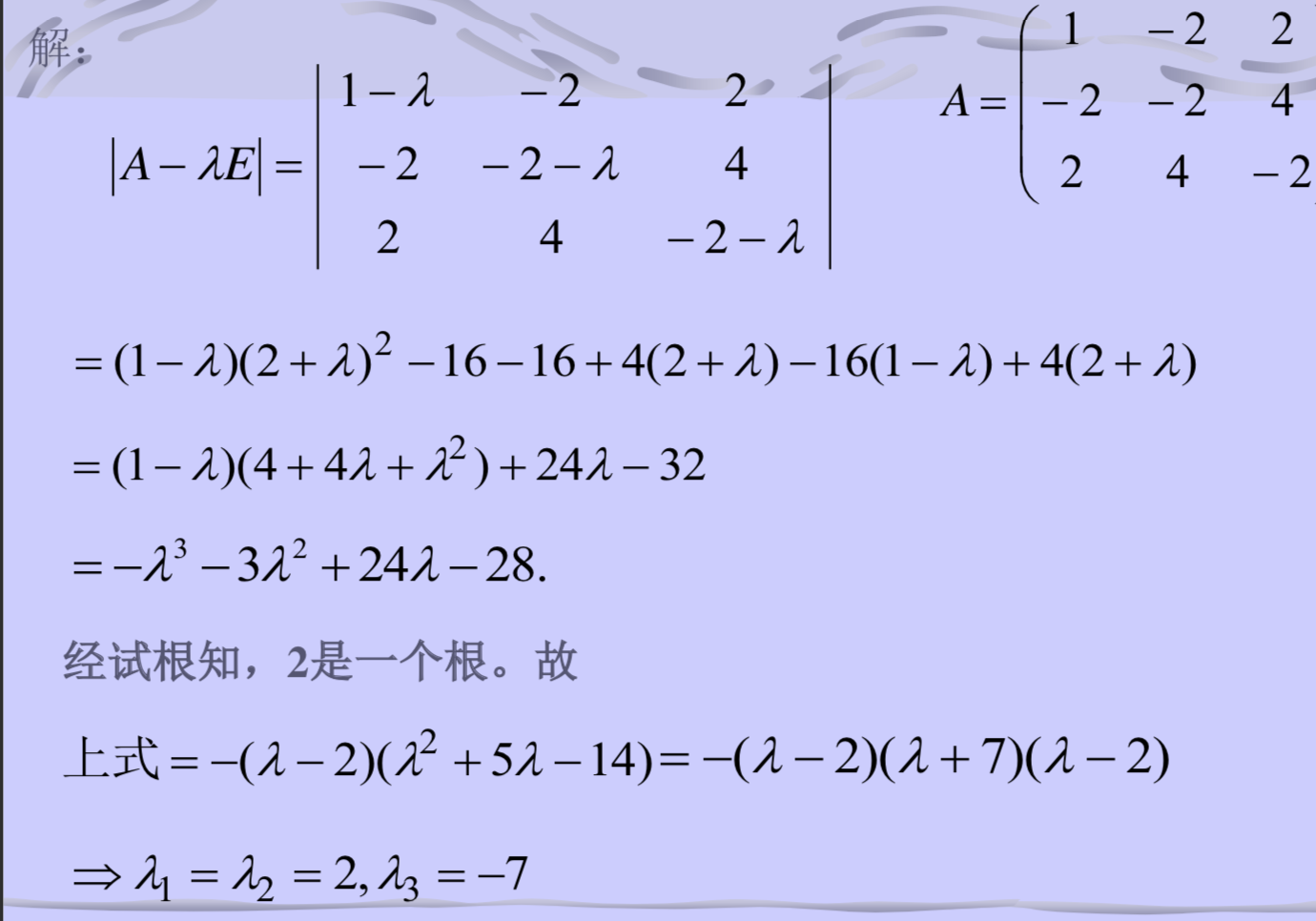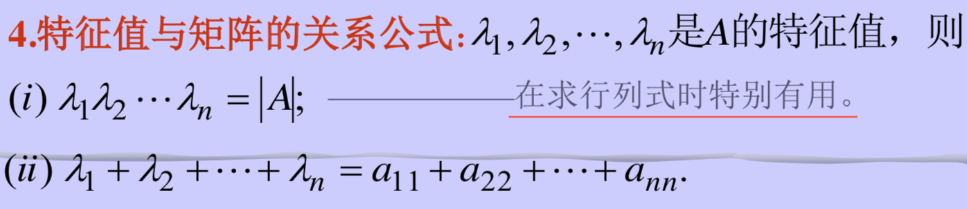 矩阵A的特征值之和=trace(A) 即矩阵A的迹。