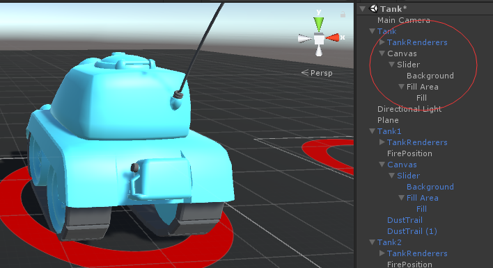 (10)把做好的血条放在坦克下面作为子物体,调整好血条的位置