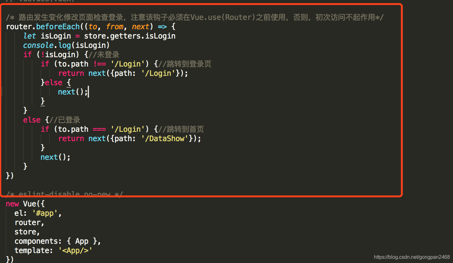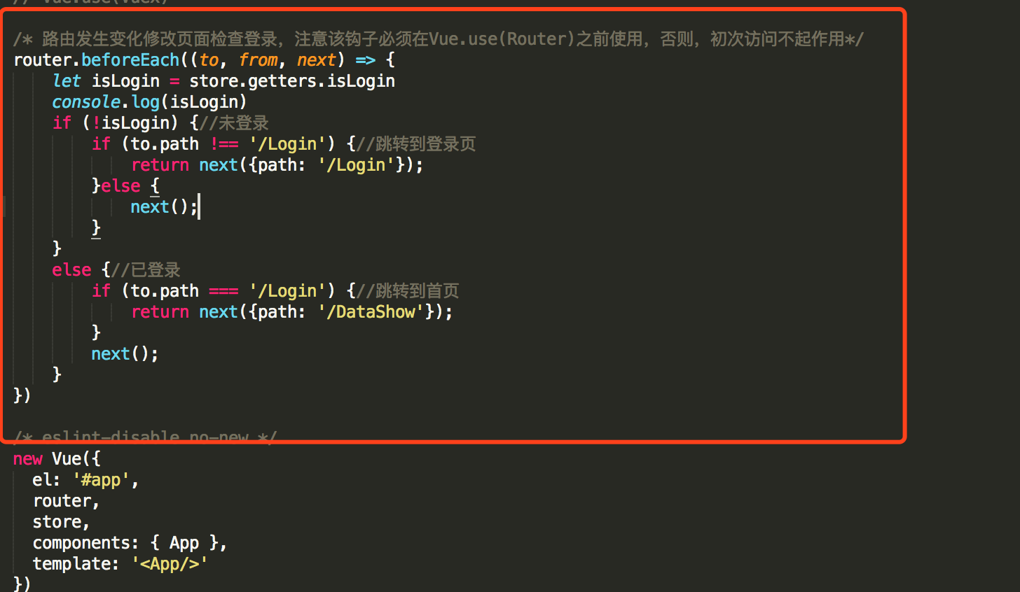 最后,在访问每一个页面前必须检查登录信息是否存在,同样在main.js里调用router.beforeEach