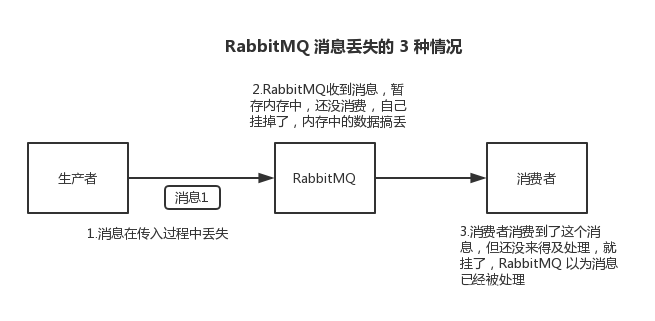 注意,哪怕是你给 RabbitMQ 开启了持久化机制,也有一种可能,就是这个消息写到了 RabbitMQ 中,但是还没来得及持久化到磁盘上,结果不巧,此时 RabbitMQ 挂了,就会导致内存里的一点点数据丢失。