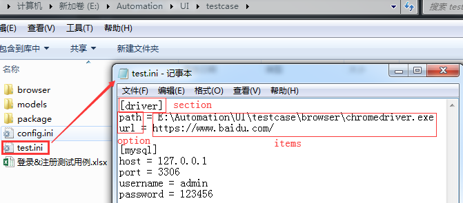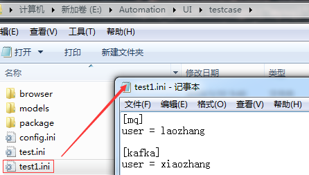 configparser模块支持读取.conf和.ini等类型的文件,那么首先在文件夹新建一个.ini文件,写入一些信息,如下图: