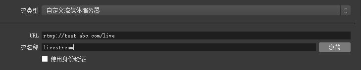 URL 填rtmp://test.abc.com/live 注意最后的live