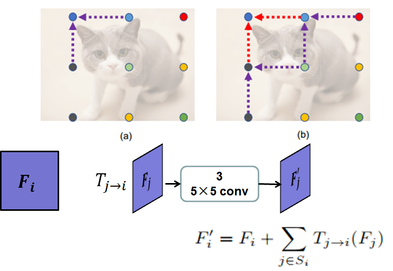 具体的融合方法如下图所示,以左上角的网格点为例,其对应的heatmap为Fi,和左上角单位距离的点称为源点,源点构成的集合设为Si,假设某个源点对应的heatmap为Fj,对Fj进行连续3次的卷积运算,卷积核大小为5×5,得到Fj',然后将源点集合中所有源点对应的heatmap进行上述运算之后与Fi相加得到融合之后的Fi',上述只是采用了单位距离的网格点,称为一阶融合,对所有点进行完一阶融合之后,再进行二阶融合,也即对目标点距离为两倍单位距离的点进行融合,如上图的右图所示。经过这样融合后的heatmap,再通过(1)部分的方法生成对应的边界框。从而提高边界框的定位精度。