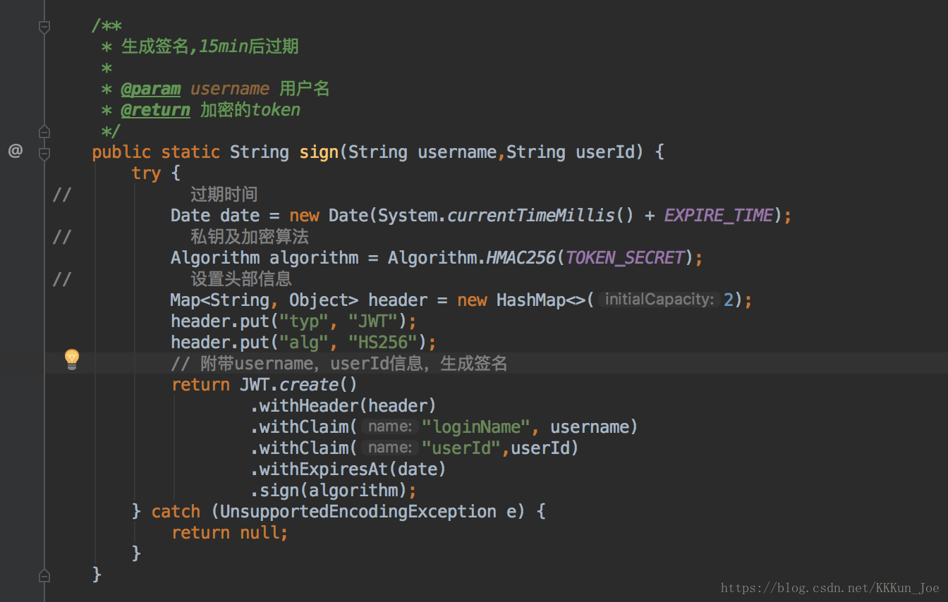 设置15分钟过期也是出于安全考虑,防止token被窃取,不过一般选择基于token认证,传输方式我们都应该选择https,这样别人无法抓取到我们的请求信息。这个私钥是非常重要的,加密解密都需要用到它,要设置的足够复杂并且不能被盗取,我这里选用的是一串uuid,加密方式是HMAC256。