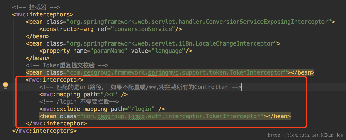 这里使用的是Spring的xml配置拦截器,放过认证接口。