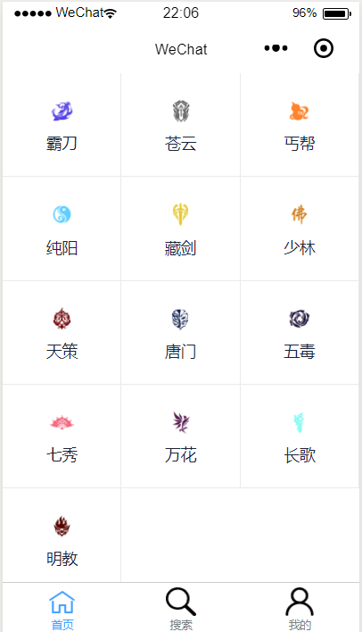 我们来分析一下这个页面,页面内容为Grid布局,可以使用IView-Webapp中的Grid 宫格组件,但官方示例是写死的标签布局,如果我们需要动态的从json数据中填充页面,我们就需要了解一下小程序相关的语法,先看下相关的代码。