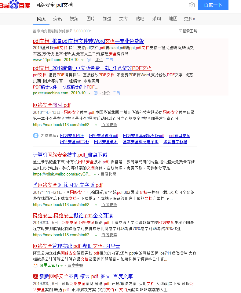 用百度或google搜索所有包含“网络安全”的pdf文档(附截图)