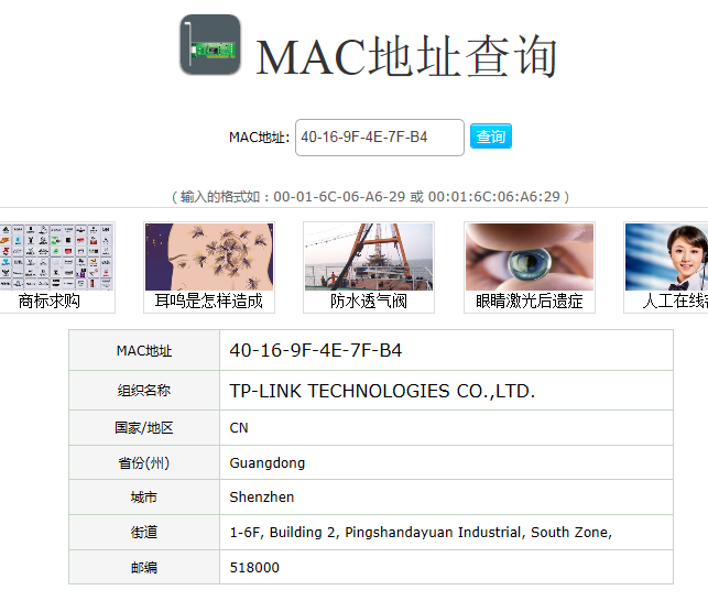 在一个案件中,获取了犯罪嫌疑人的一个MAC地址:40-16-9F-4E-7F-B4,请查询该MAC地址对应的厂商是(附截图)