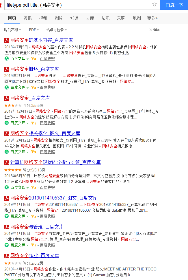 用百度或google搜索所有包含“网络安全”的pdf文档(附截图)