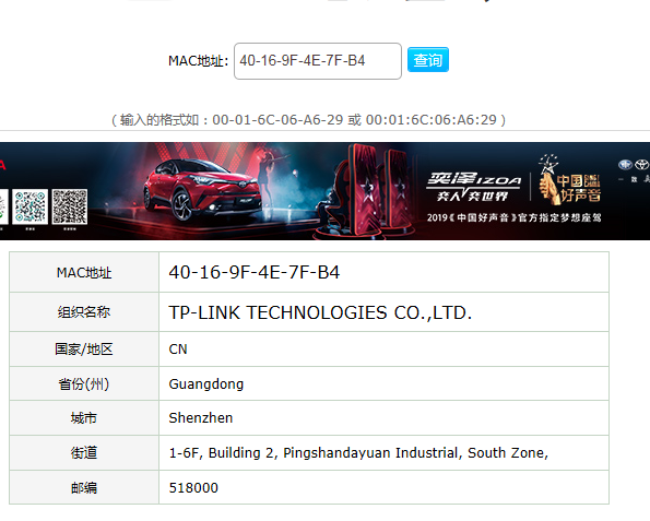 在一个案件中,获取了犯罪嫌疑人的一个MAC地址:40-16-9F-4E-7F-B4,请查询该MAC地址对应的厂商是(附截图)