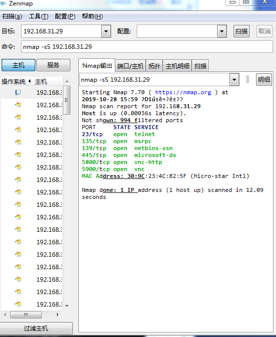 选择一个存活IP地址,扫描所开放的端口(分别用ping扫描,syn扫描尝试),并查询常用端口所对应的服务及操作系统信息。