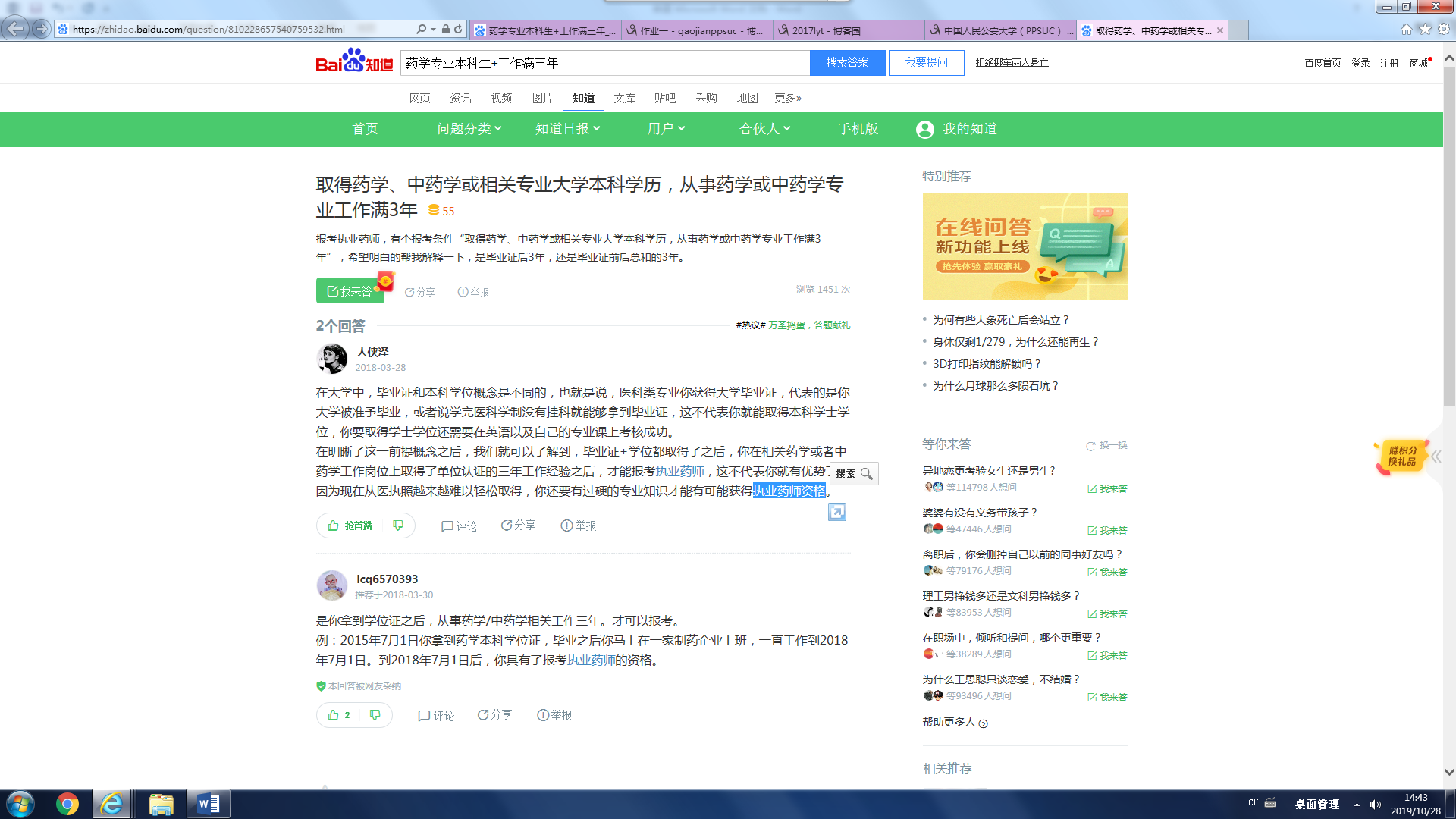 小丽是药学专业的一名本科生,现已从事药学专业的工作,目前她想考取一个资格证,但是报名条件中要求其工作满三年。那么,小丽想考取的是什么证。(请回答并附截图证明。)