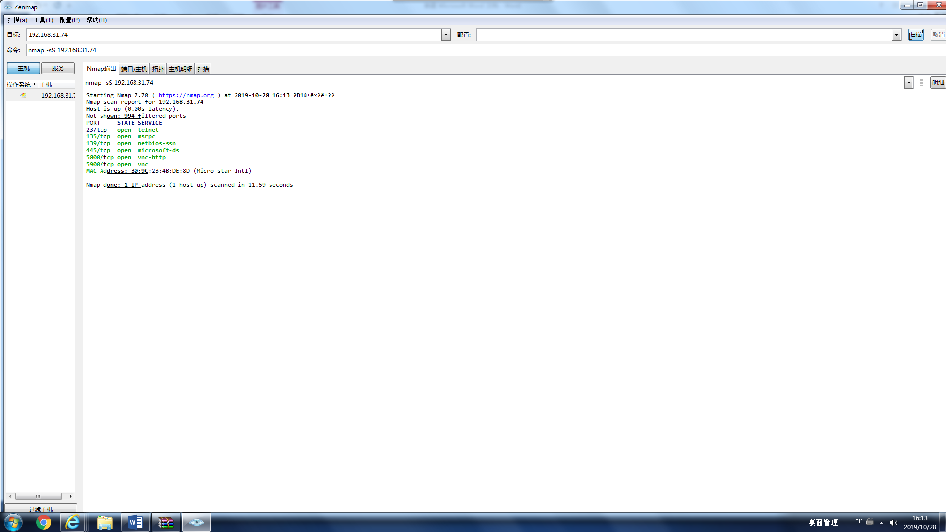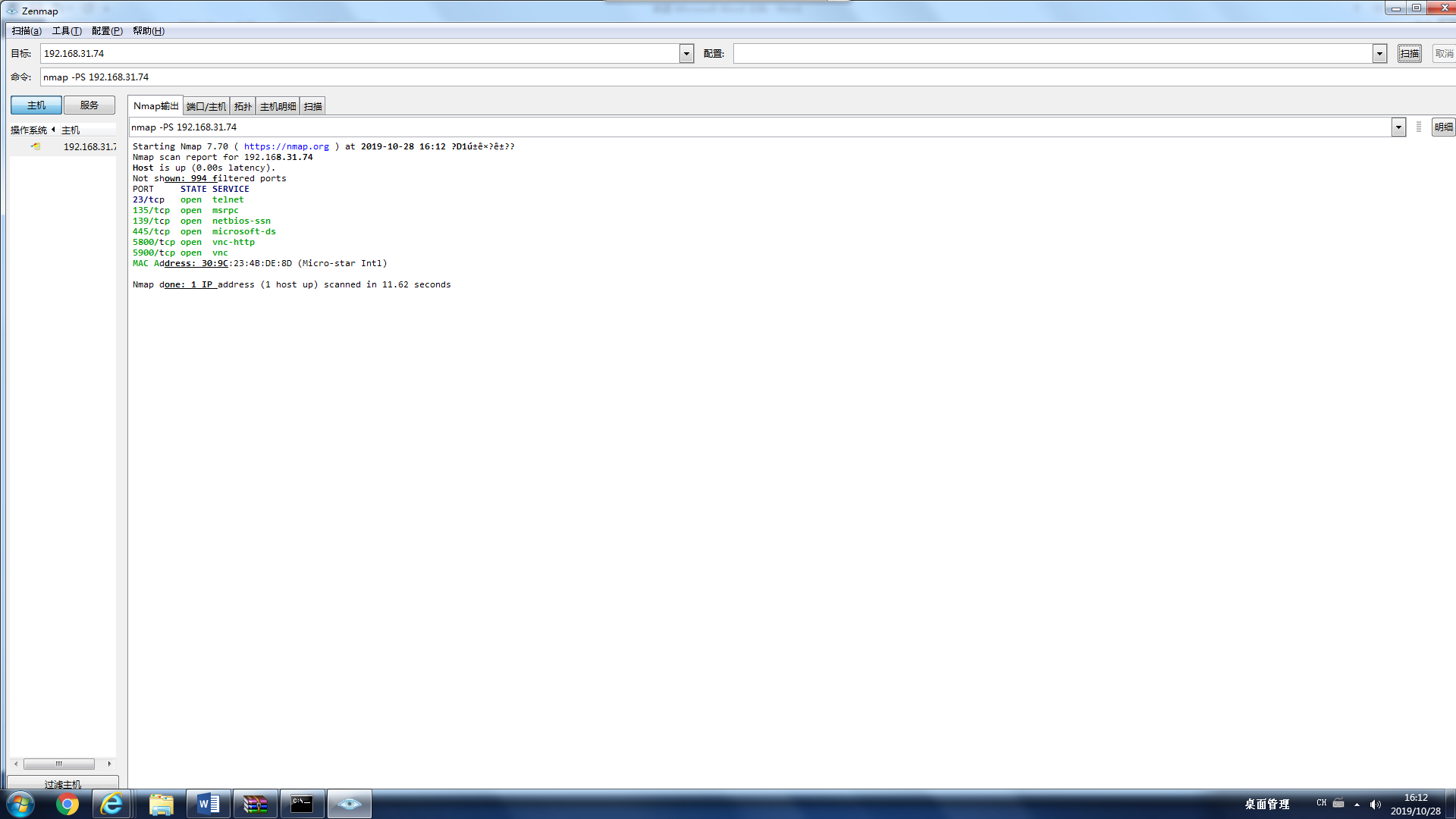 选择一个存活IP地址,扫描所开放的端口(分别用ping扫描,syn扫描尝试),并查询常用端口所对应的服务及操作系统信息。