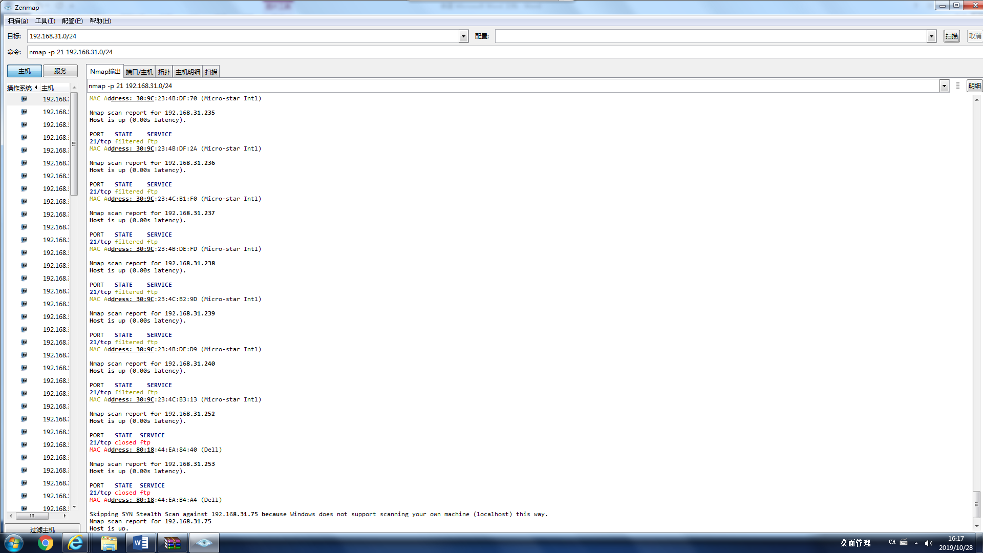 在实验楼上网的局域网内,请扫描出来,哪些机器开启了ftp服务,哪些机器开启了远程桌面连接服务,并附截图证明。